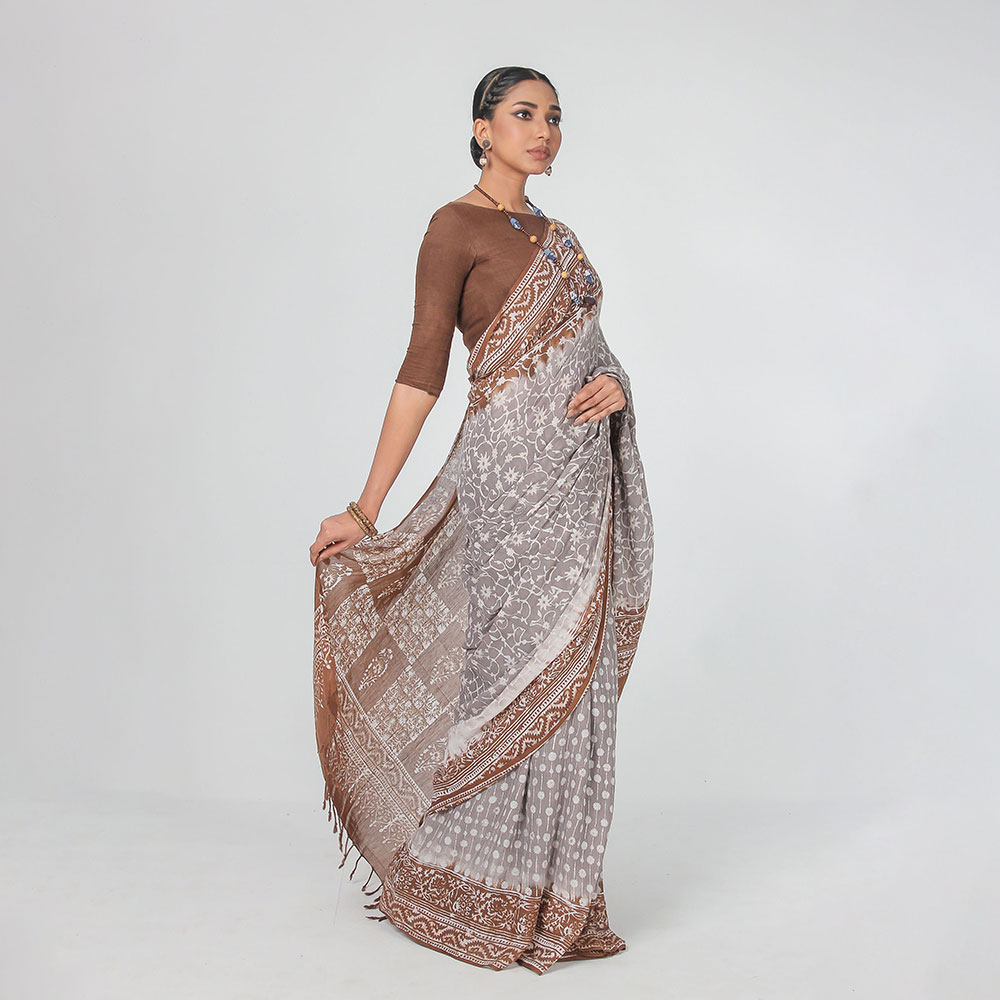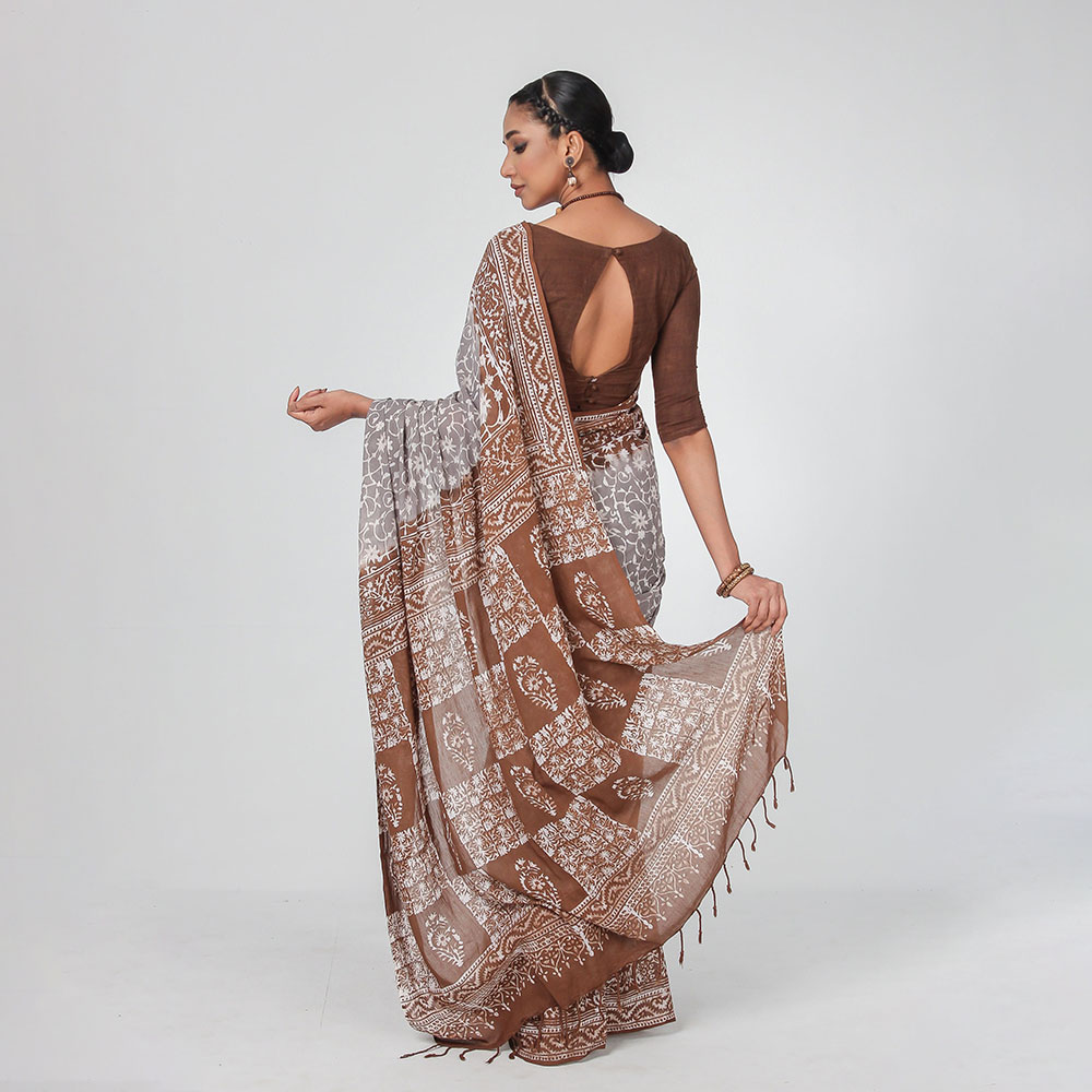 This Wax printed cotton saree is dyed using the natural ingredients to bring out the marvelous soothing color of the product. All Aranya products are handmade, using natural materials, within a fair trade framework.
